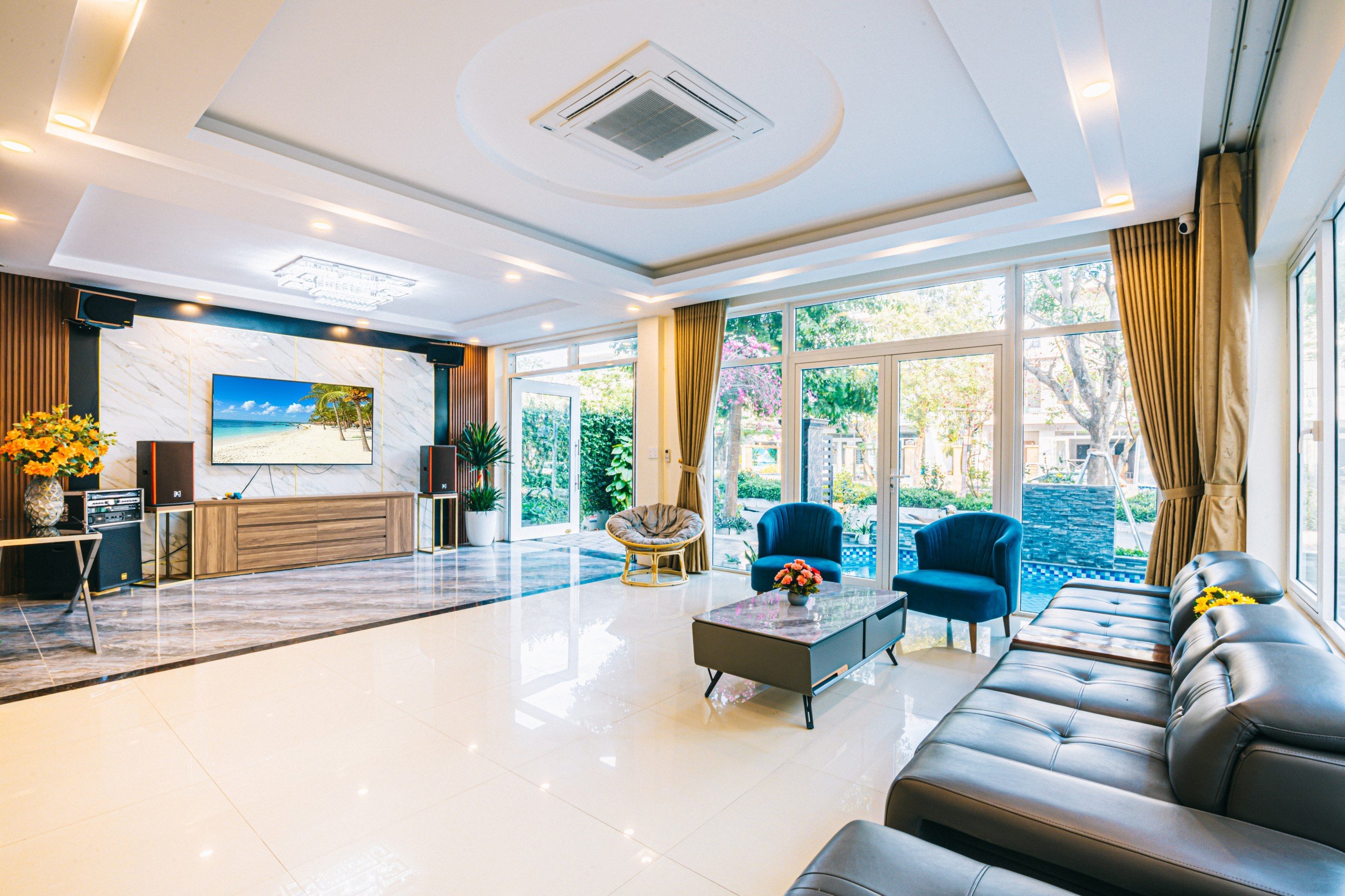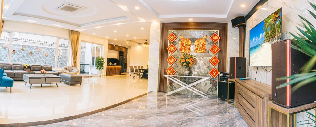 ✓ 1 phòng khách rộng : Tivi 75in, truyền hình internet TV, Điều hòa, Quạt cây, Wifi, Bàn ghế tiếp khách uống trà, Karaoke, WC)