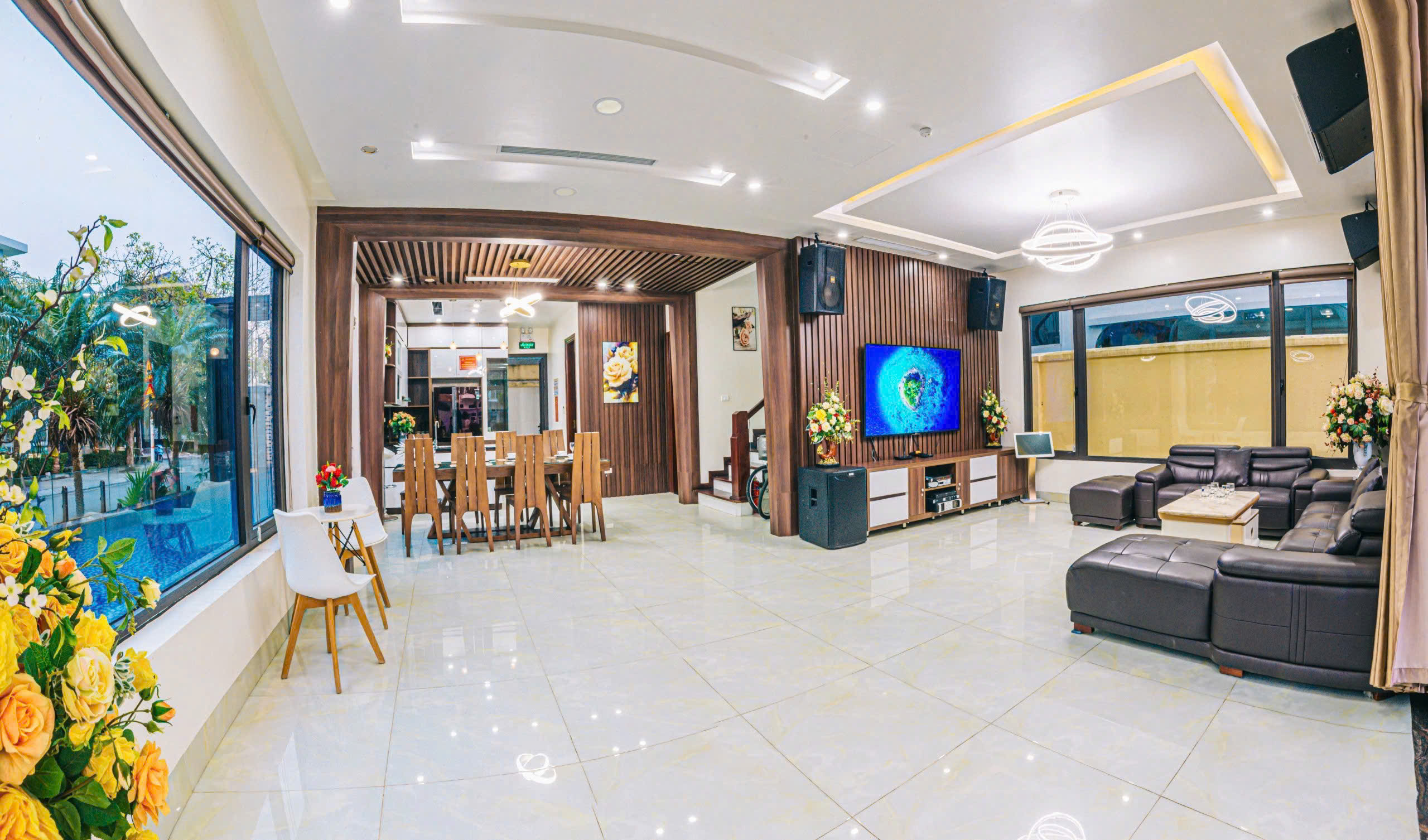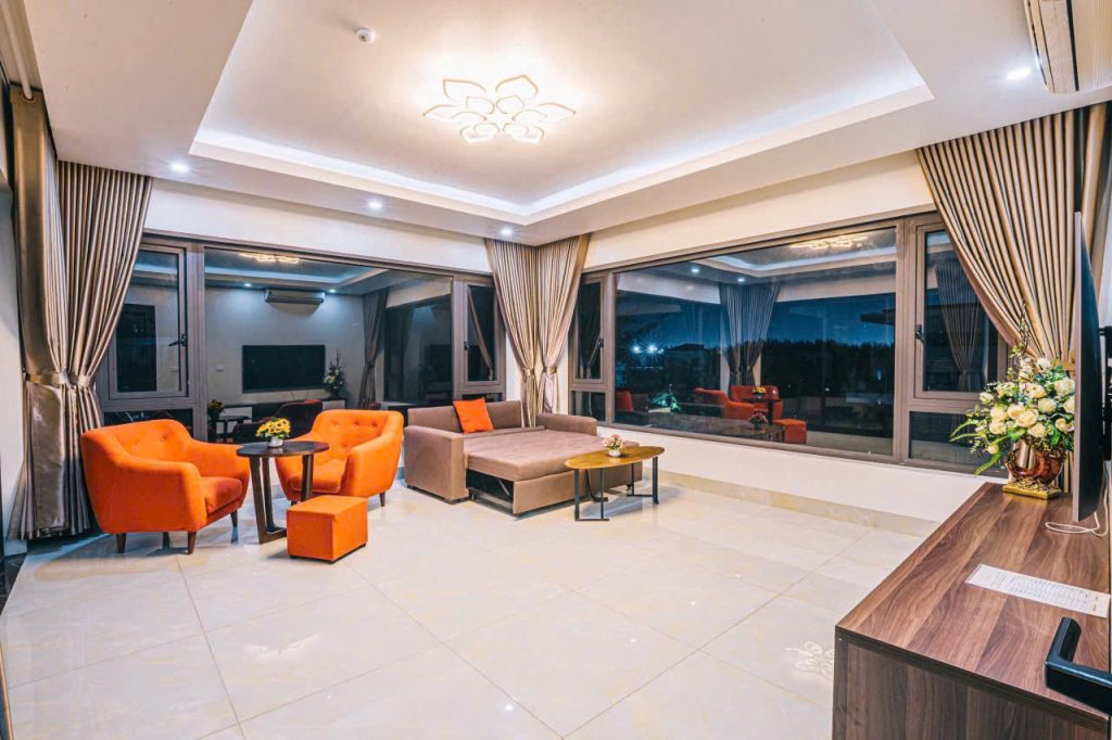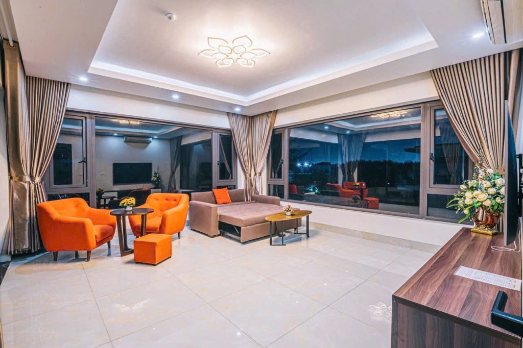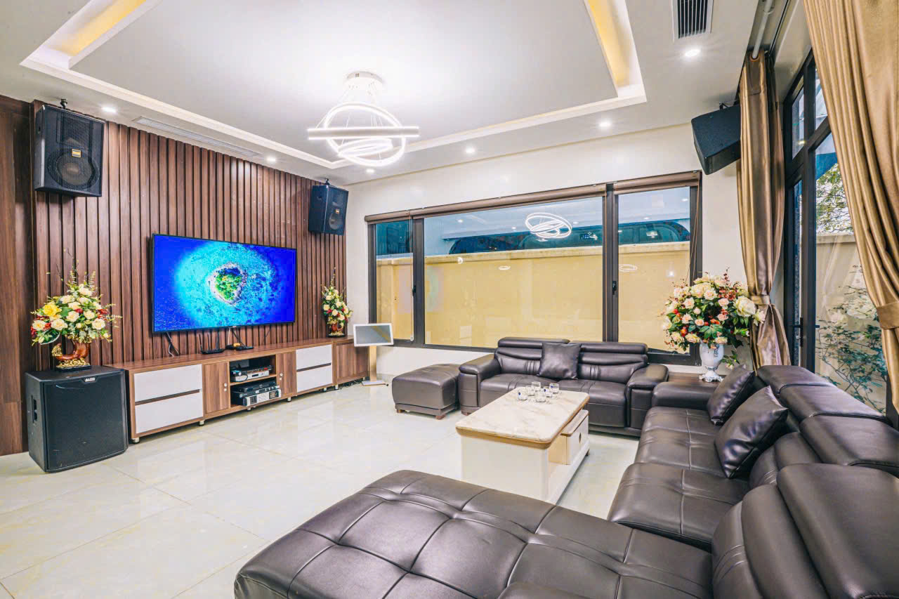 ✓ 1 phòng khách rộng : Tivi 75in, truyền hình internet TV, Điều hòa, Quạt cây, Wifi, Bàn ghế tiếp khách uống trà, Karaoke, WC)