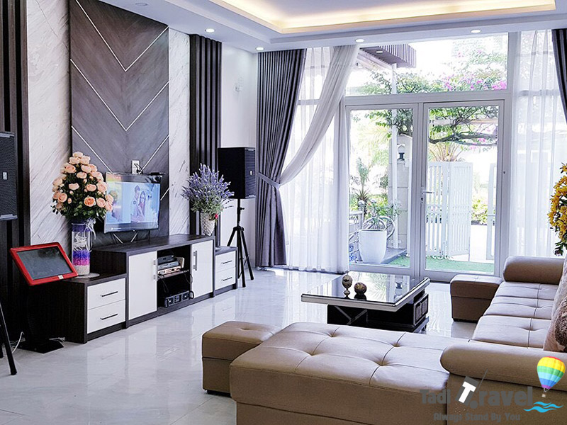 ✓ 1 phòng khách rộng : Tivi, truyền hình internet TV, Điều hòa, Quạt cây, Wifi, Bàn ghế tiếp khách uống trà, Karaoke, WC)